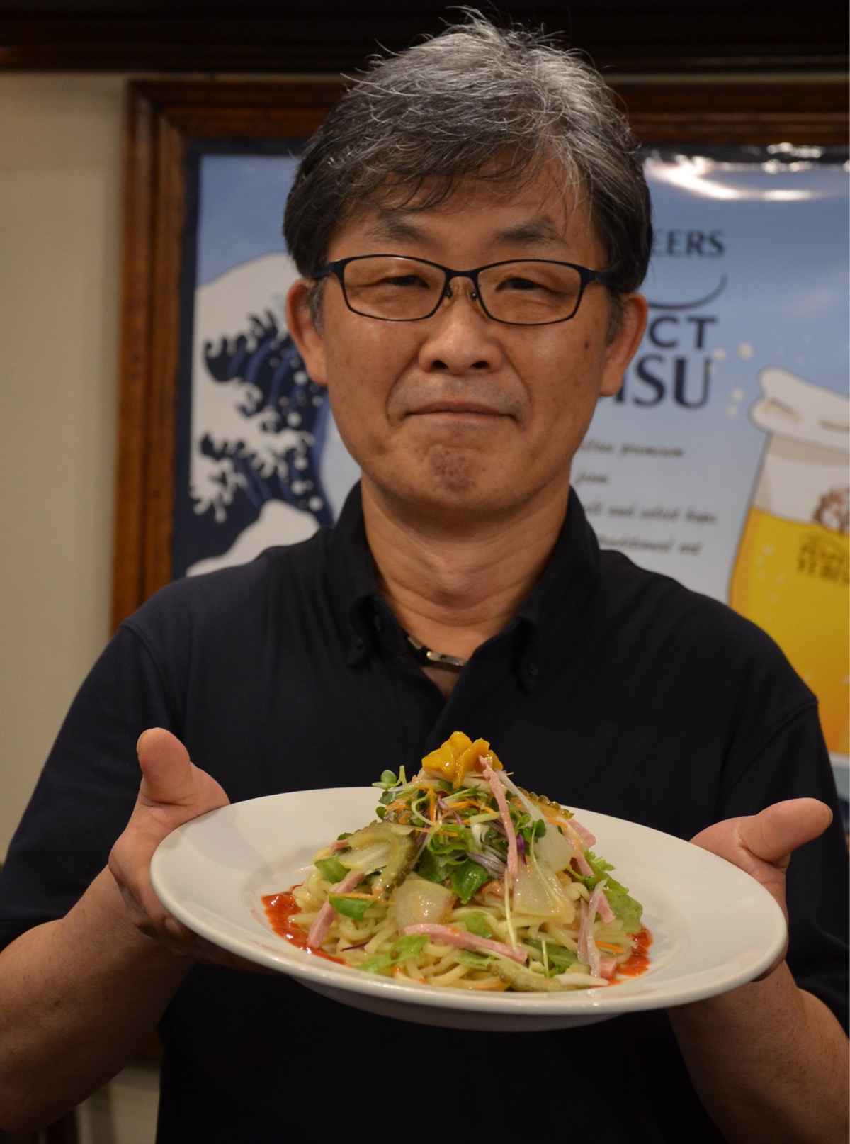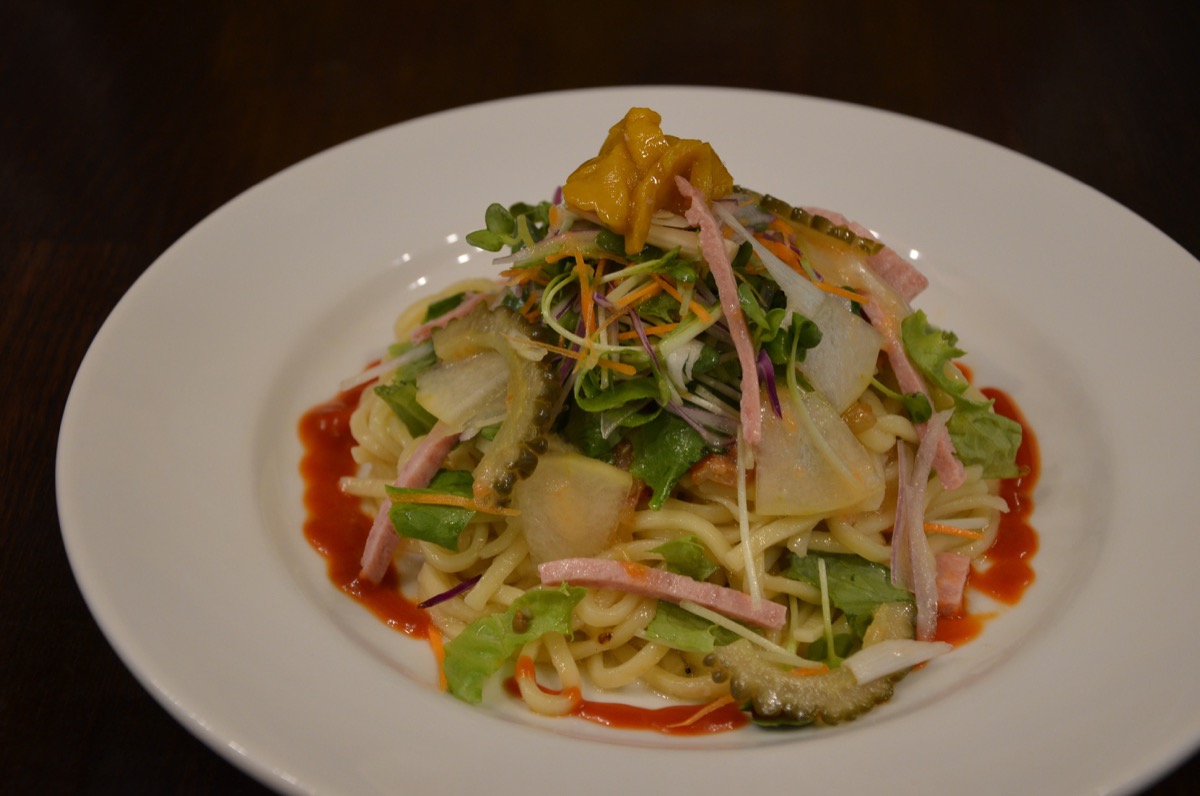 麺が200gとボリュームたっぷりですが、つるんとさっぱりサラダパスタ感覚であっという間に完食。和洋中の調味料(和風ドレッシング、ケチャップ、ごま油)を使って作ったナポリタンは、食欲が増す味ですっかりやみつきに。「沖縄を感じる冷製ナポリタンで夏を乗り切って下さい」とシェフの金良幸さん。
