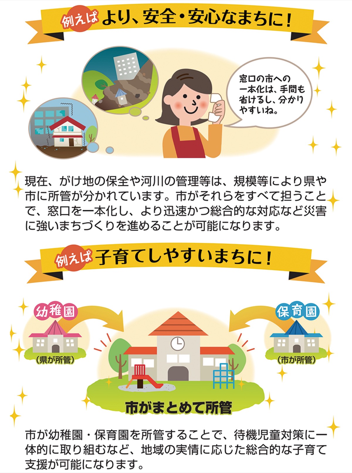現在の指定都市制度では、市と県の間で、事務や権限が分かれているため、窓口が分散し、子育て支援や、まちづくりなどの分野で非効率な二重行政が発生しています。また、県から移譲された事務事業について必要な財源措置が不十分であるなどの課題があります。