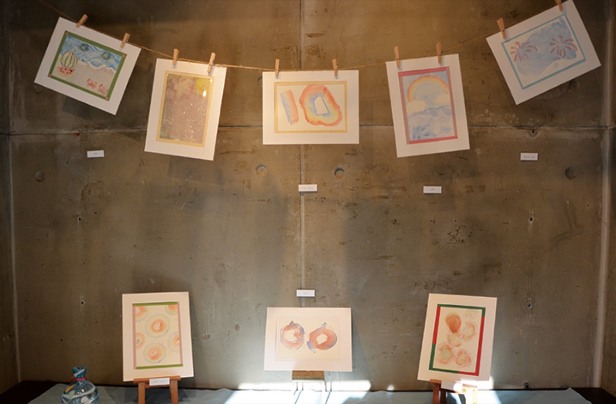 今夏に同会が実施したワークショップの参加者の作品を展示。発色性が高い水彩専門の画紙や絵の具を使用する一方で、ラップで波模様を表現、塩を散らし砂浜の立体感を出すなど、画材に日用品を取り入れ、工夫を凝らした力作約50点が並んでいる。