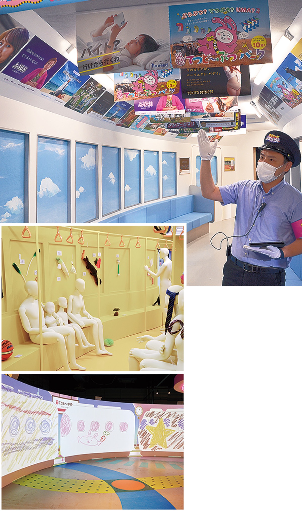 「てきと〜でもいいんだ」をコンセプトに、満員電車や駅弁、アナログゲームのコーナー、車両内展示やお絵かき電車=写真=など、肩の力が自然と抜けるような様々な脱力体験が楽しめる。