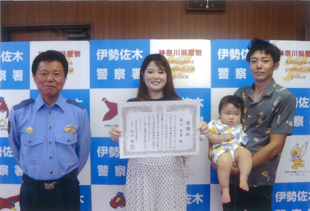 西区在住の78歳の女性を振り込め詐欺の被害から守ったとして、会社員の熊谷聖菜さんが伊勢佐木警察署から表彰された。8月10日に同警察署で鈴木雅己署長から感謝状が手渡された。