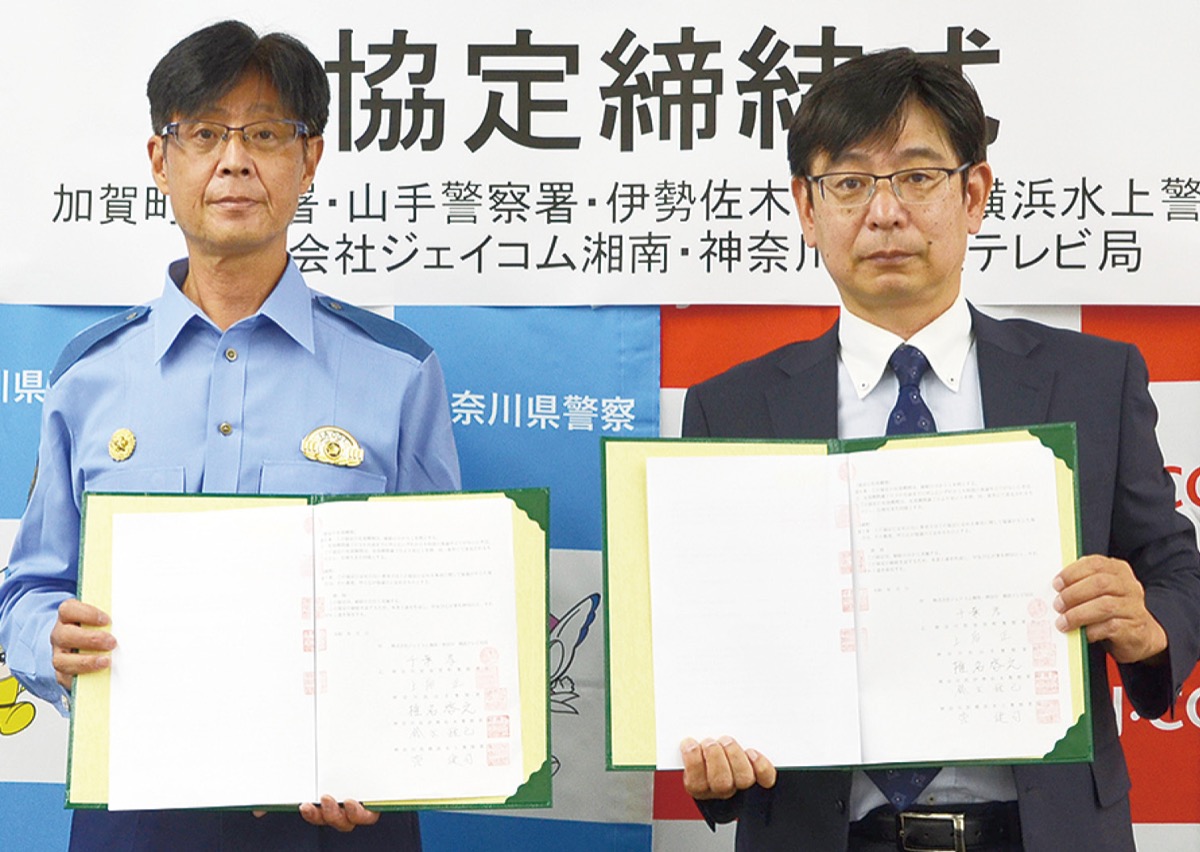 安全で安心して暮らせる地域社会の実現に向けて、中区内4つの警察署と(株)ジェイコム湘南・神奈川 横浜テレビ局は8月26日、地域安全協定を締結した。被害が増加している特殊詐欺をはじめとする各種犯罪の未然防止のため、相互の連携を強化する。
