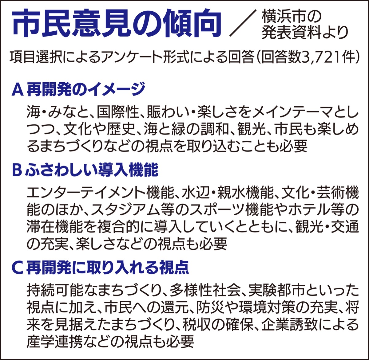 山下ふ頭再開発の新たな事業計画策定に向けた市民からの意見募集の結果概要が8月29日に発表された。募集は昨年12月23日から今年6月30日まで。項目選択のアンケート形式で回答数は3721件。その内、自由意見は1942件あった。