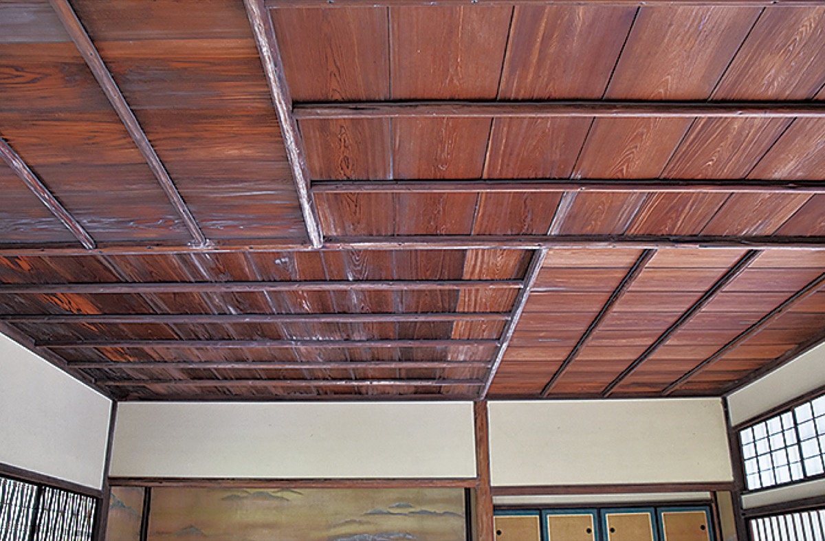 数寄屋造りは、自由度のある風流な建築意匠ということもあり、城でいえば本丸にあたる「住之江の間」(第二屋)の天井をはじめ、各所に遊び心のあるデザインが散りばめられている。