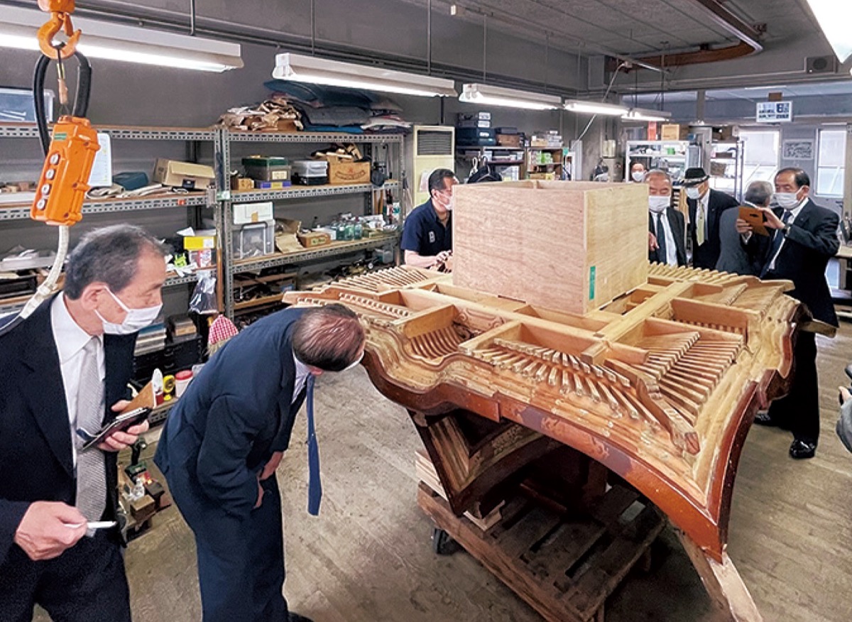 同神社は2023年に創建350年を迎えるにあたり、造られてから約90年が経過し、一部に傷みが見られていた大みこしの復元修繕を行っている。「千貫みこし」とも言われる高さ4mの大みこしの全体的な復元修繕は初めて。昨年12月に東京の専門業者「宮本卯之助商店」に引き渡され、作業が進んでいる。5月には、氏子らが作業現場を視察し、順調に進んでいることを確認した。