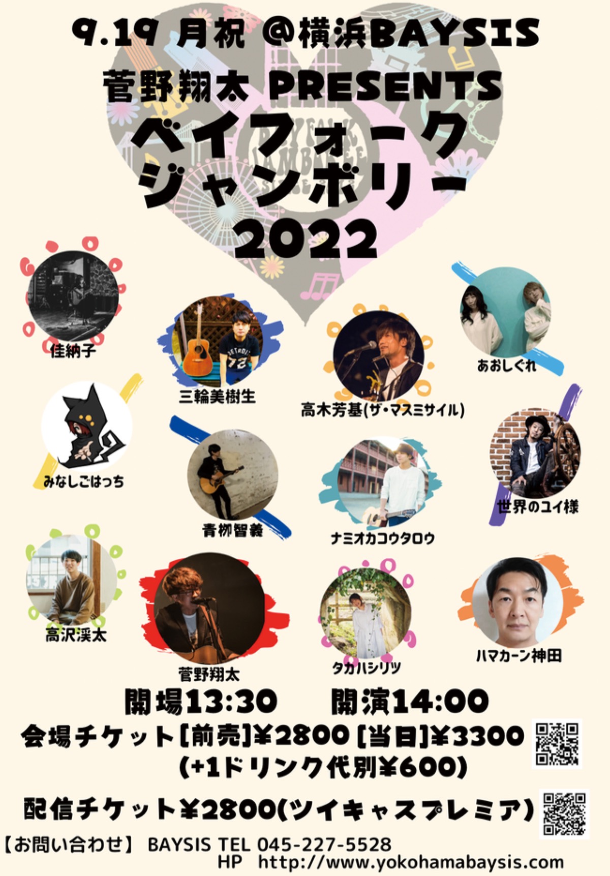 横浜を拠点に活動するシンガーソングライター菅野翔太さん主催のアコースティックイベント「ベイフォークジャンボリー」が9月19日(月・祝)、関内のライブハウス「横浜BAYSIS」=中区常盤町=で開催される。
