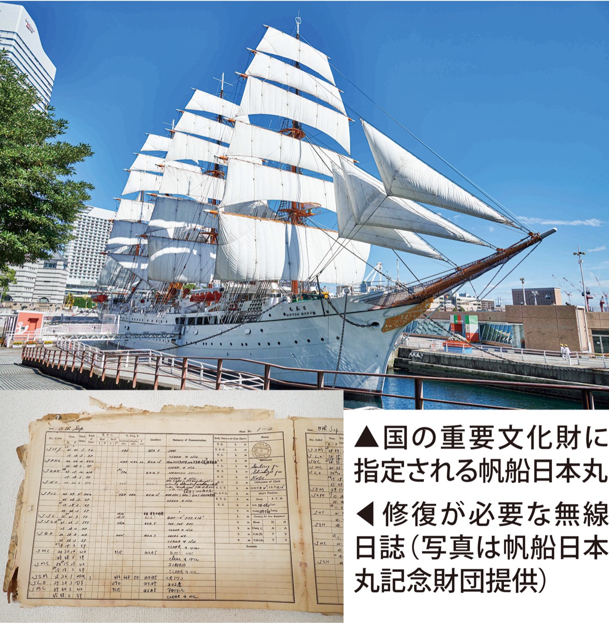 帆船日本丸は1930(昭和5)年に建造された練習帆船として、多くの船員を養成し、海運業へ貢献。また航海日誌、無線日誌などの記録類が多く残っていることが高い評価を受け、2017年に国の重要文化財に指定されている。18年度にはドックの海水をすべて抜き、帆船日本丸の船底等の大規模修繕を実施しているが、船内は木製部分の腐食や、鉄製部分の錆びつきなど、継続的な維持修繕が必要な状態だ。帆船日本丸の航海活動が記載されている日誌は、昭和の船舶無線通信の有り様を今に残す貴重な資料となっているが、損傷が激しいものが多く、これ以上劣化が進行すると修復自体が困難になってしまうという。
