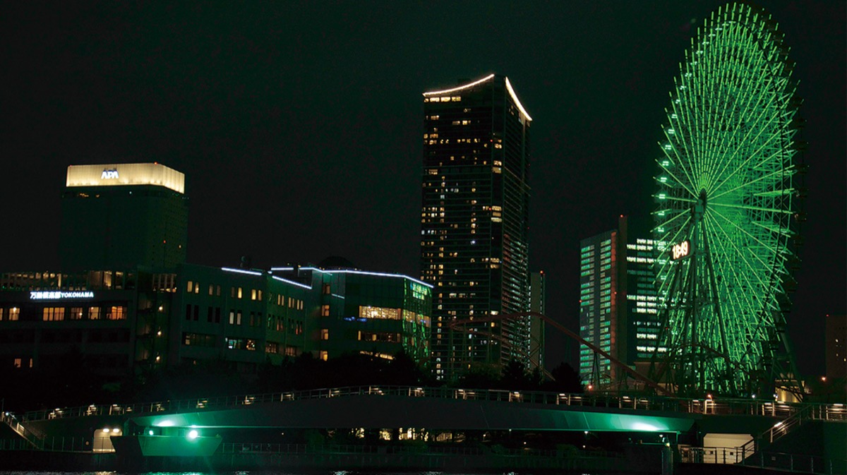 世界ミトコンドリア病啓発週間に合わせ9月22日から26日まで、みなとみらいの臨港パークと新港パークをつなぐ歩行者デッキ「女神橋」が緑色にライトアップされた。