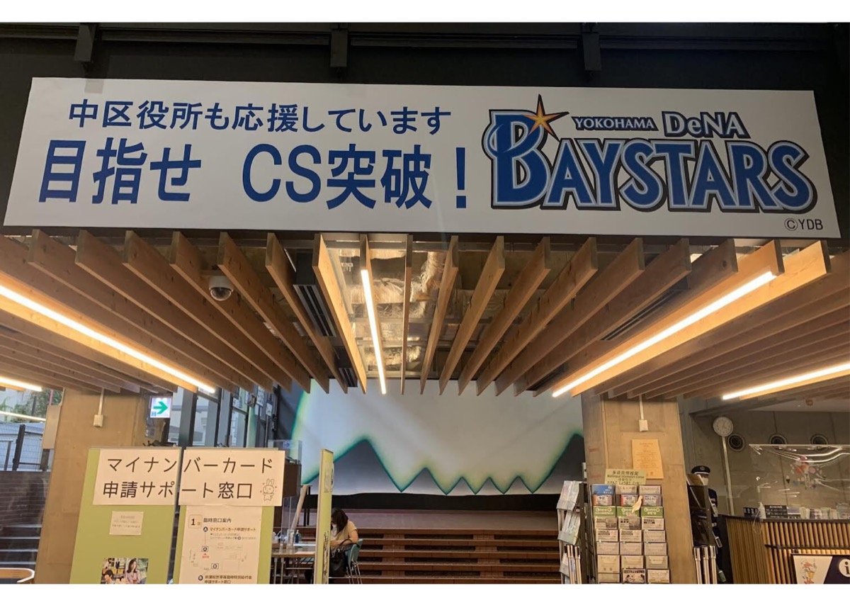 幕は縦0・73m、横3・6m。「目指せCS突破!」というメッセージと、ベイスターズのロゴマークを大きく掲示。「中区役所も応援しています」という言葉も添えられている。