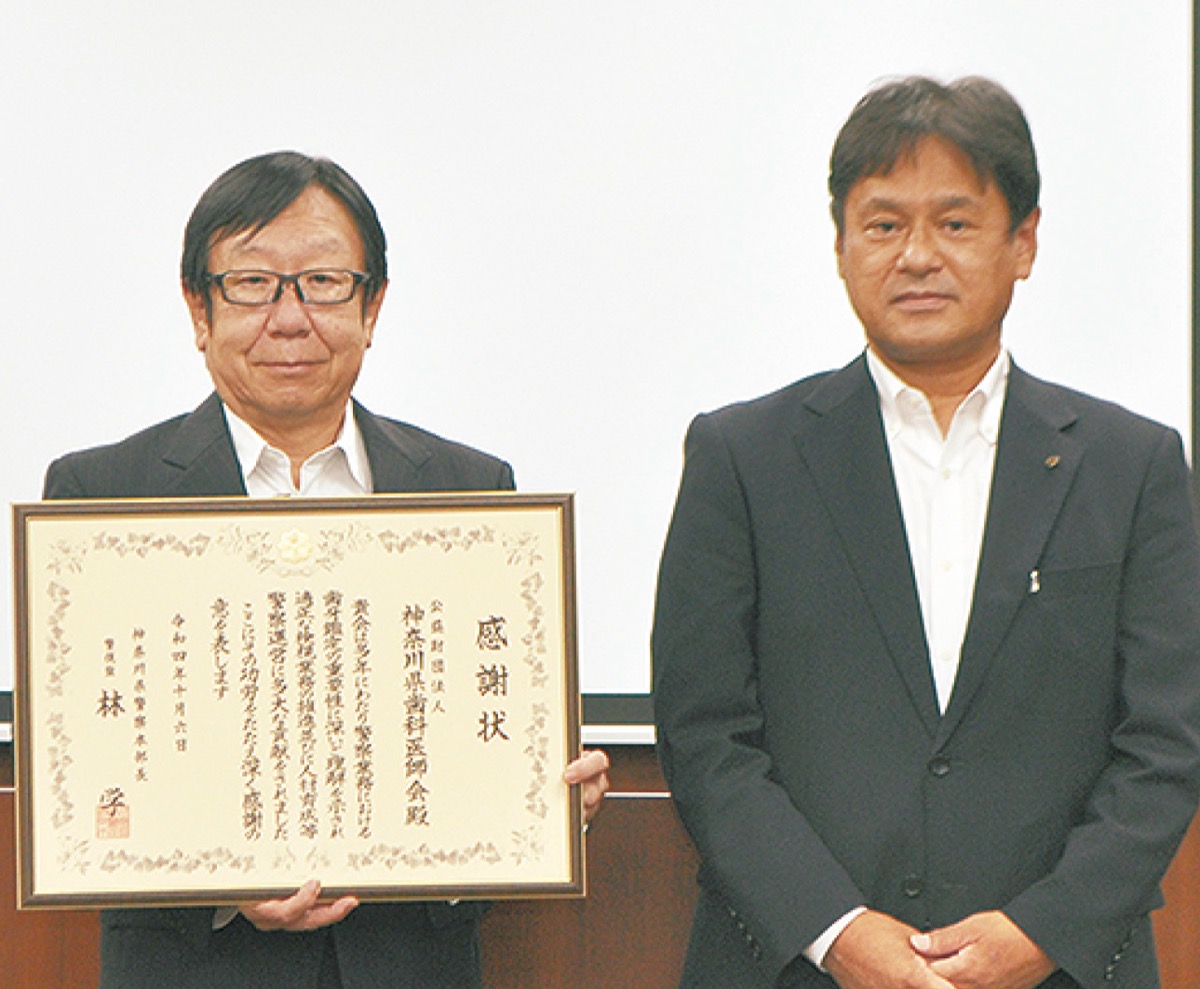 神奈川県歯科医師会は、県内54の警察署や海上保安庁に配置されている警察協力歯科医に、DNA鑑定による歯牙鑑定や検視の研修会を開催するなど警察に協力してきたとして10月6日、神奈川県警察本部長から感謝状が贈呈された。当日は県警刑事部捜査第1課長の加藤秋人氏が同会の松井克之会長に感謝状を手渡した。