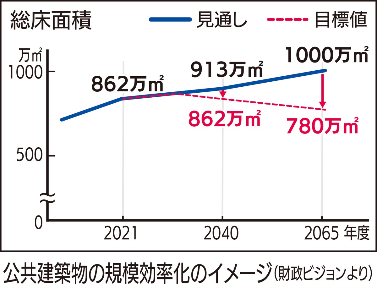 徐々に適正化を進め、市内施設の総床面積を21年度と比べて40年度時点で増やさず、65年度時点での1割縮減を目標とする。「整備中の話を止める訳ではない。サービスを維持するため、適切に配置していく」と市担当者。10月26日まで素案への意見を募集し、年内に計画を固める予定だ。
