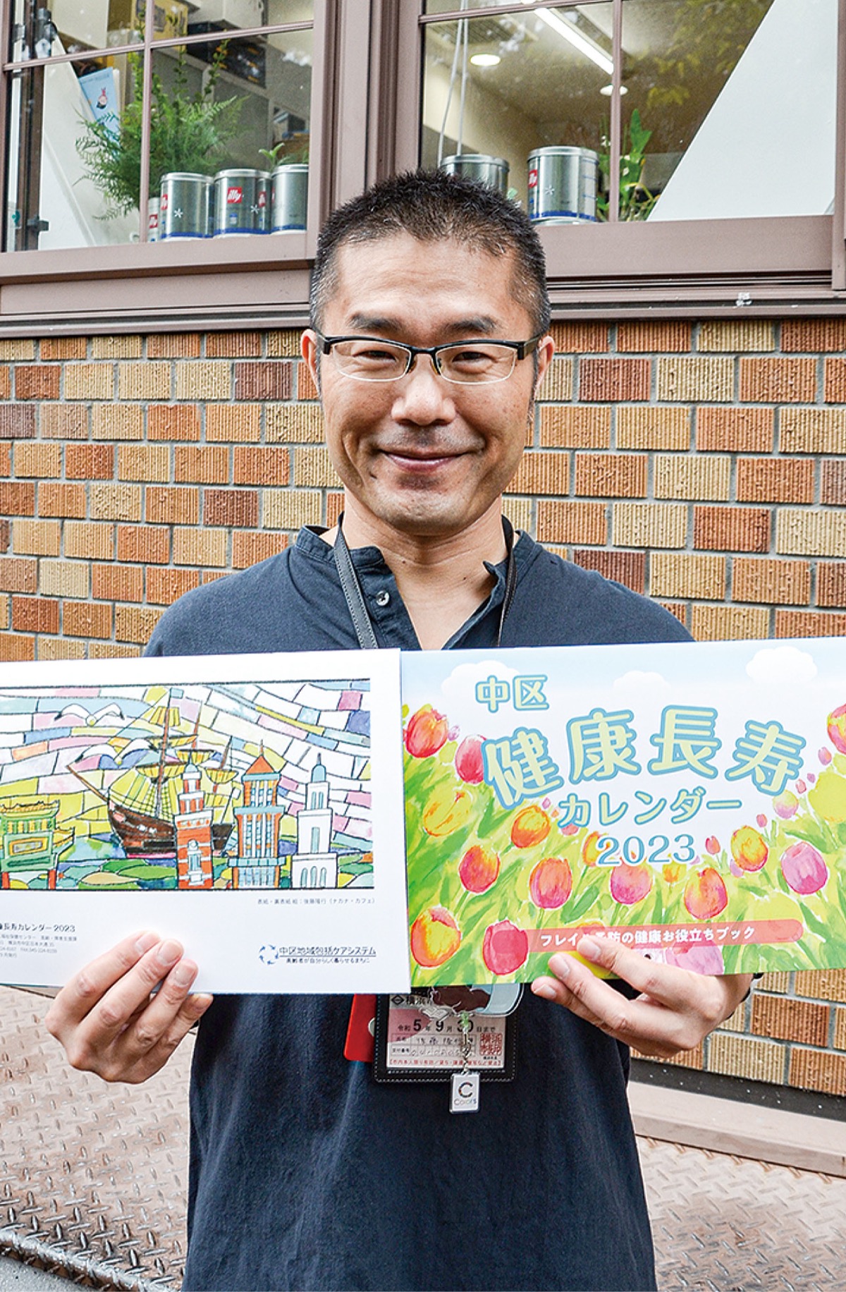 高齢者の健康寿命の延伸のため、中区が作成する「健康長寿カレンダー」がこのほど完成した。表紙と裏表紙は、中区役所別館1階の「ナカナ・カフェ」で働く後藤隆行さん(48)が作画。赤やオレンジ、黄色など元気に咲くチューリップの絵が、カレンダーを使用する人たちに元気与を与えているという。
