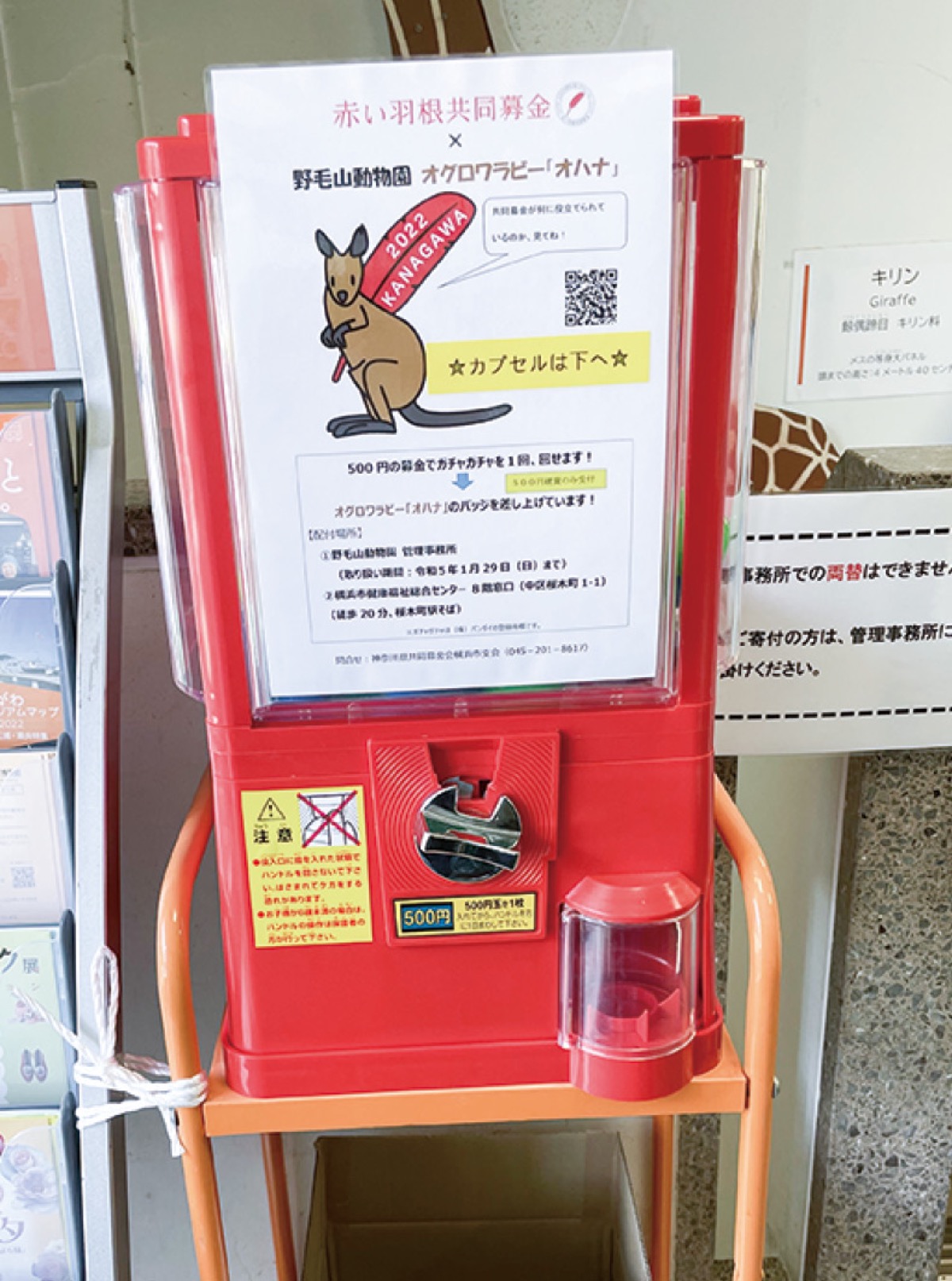 「オハナ」をモチーフにしたピンバッジも作成。野毛山動物園の管理事務所入口には、カプセルトイ(ガチャガチャ)の機械を設置し、ピンバッジによる募金(1回500円)も(数量に限りあり)。