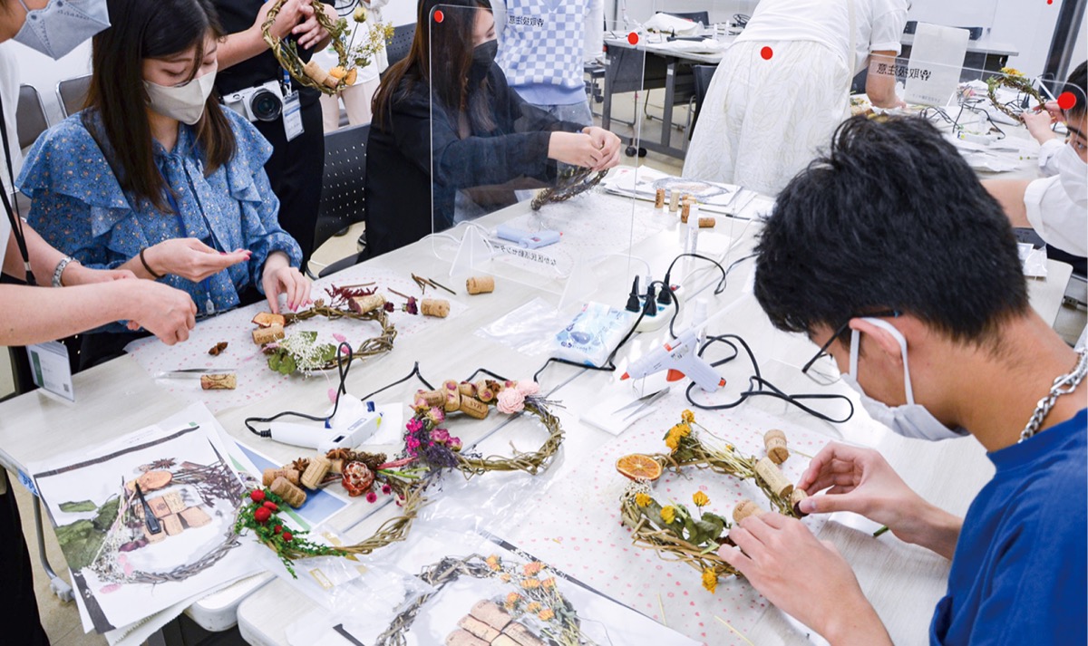 結婚式場などで装飾用として使われ、その後使い道がなく廃棄されてしまう花「ロスフラワー」と、ワインのコルクを使ってリース作りを行うワークショップが10月3日、なか国際交流ラウンジで行われた。中区とSDGsイベントの企画・運営などを手掛ける「Liko SDGs」が協力し実施。高校1年生から大学1年生の8人が参加した。