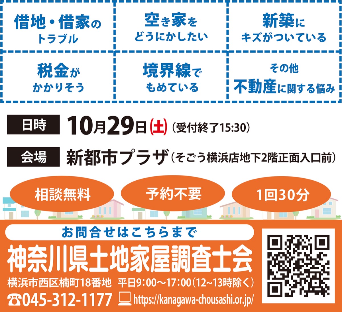 相続登記や空き家、建物の瑕疵問題など不動産にかかわる悩みに専門家が応えてくれる無料相談会が10月29日(土)、横浜駅東口のそごう横浜店地下2階正面入口前、新都市プラザで開催される。