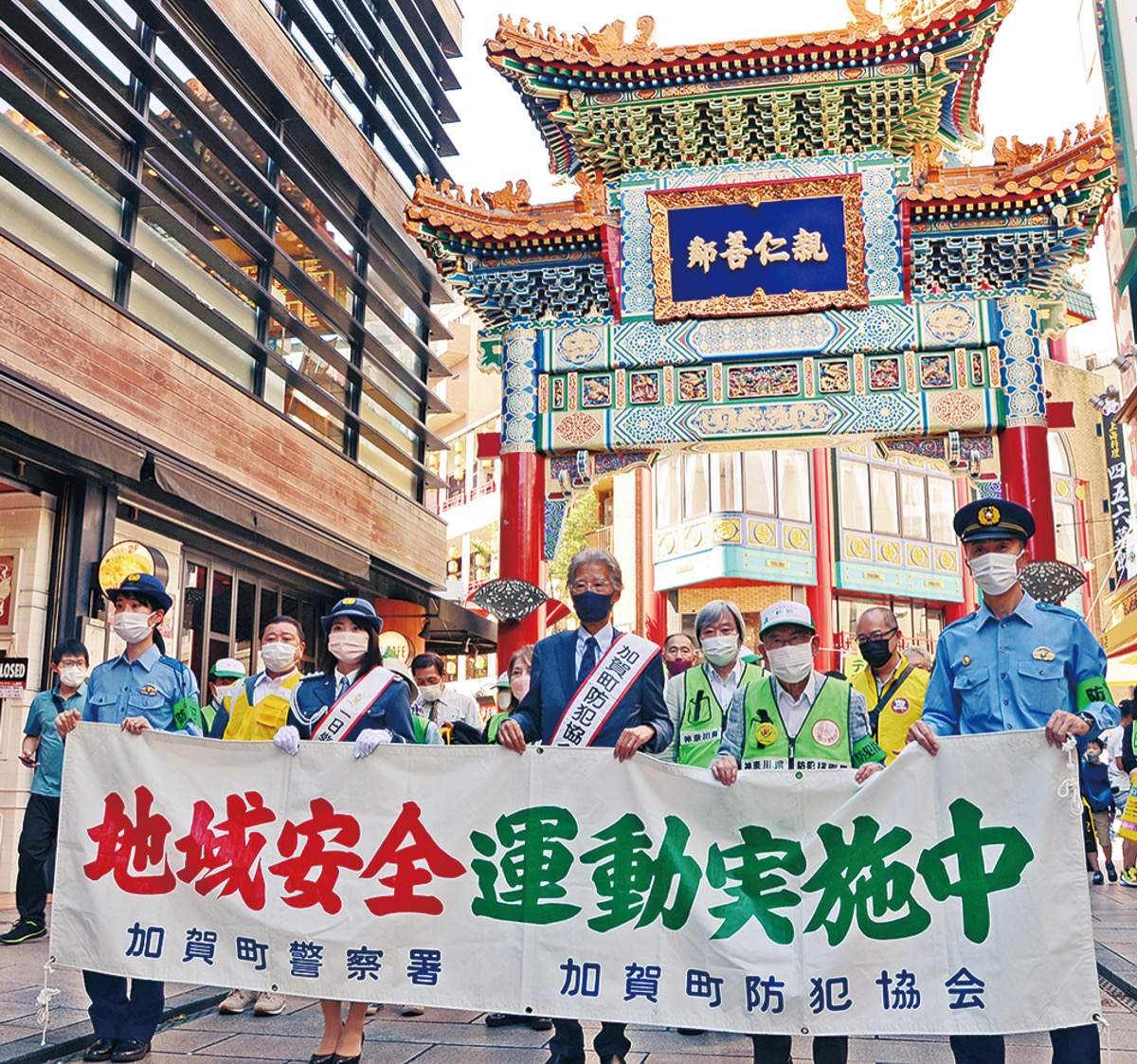当日は、加賀町防犯協会(高木正俊会長)や加賀町防犯指導員連絡協議会(原洋二会長)の会員らが参加。藤坂さんと関係者らは横断幕を掲げ、横浜中華街を巡回し、通行人にチラシやグッズなどを手渡し、急増する詐欺被害に遭わないよう、防犯意識を高めることを呼び掛けた。