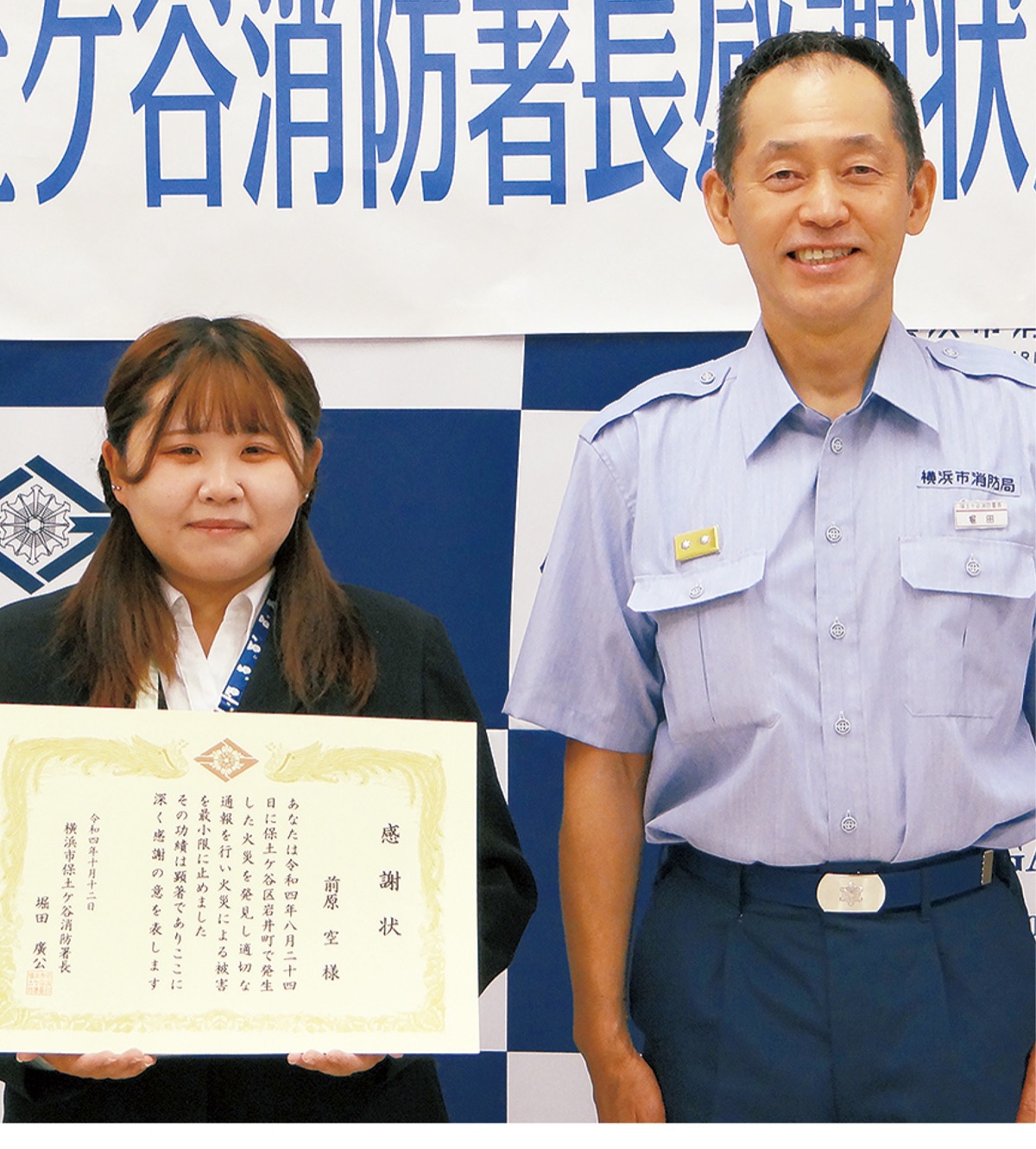 火災の被害を最小限に留めたとして、平沼小学校の教諭・前原空さん(23)が10月12日、保土ケ谷消防署から表彰された。