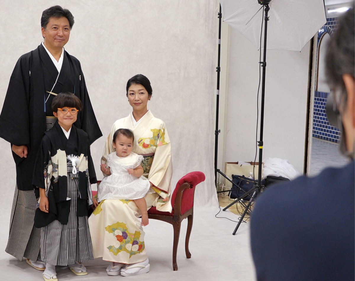 昨年絹婚式を迎えた黒須裕章さん(46)、芙美さん(44)さん夫妻=鎌倉市在住=は、子どもと一緒に家族4人で参加。俳優・古谷一行さんがなくなった時にSNS投稿された親子3世代の和装写真に魅せられ「家族の思い出を和装写真として残したいと思った」と芙美さん。裕章さんは「結婚式をしていないので夫婦の記念写真も、きものも初めて」と照れながらも「良い思い出になった」と話した。