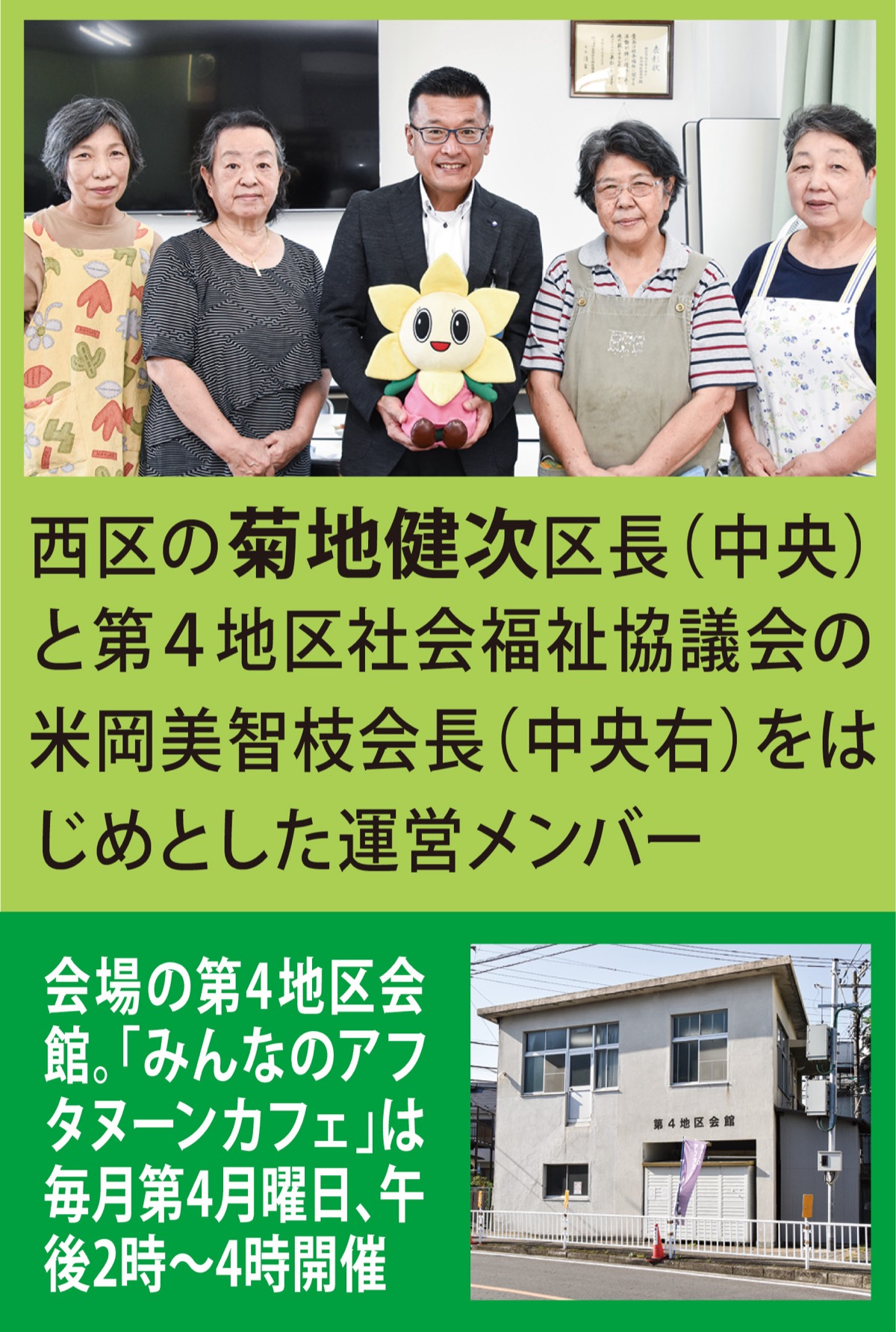 野毛山公園などがある第4地区。今年1月に、手作りのおやつでもてなすお茶のみサロン「みんなのアフタヌーンカフェ」が地区会館を会場にスタートしました。多世代が気軽に集まれる、地域の憩いの場を目指しています。