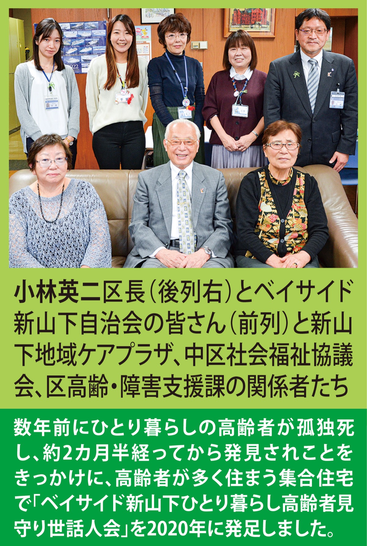 ベイサイド新山下自治会では、地域包括支援センターや区社協などと協力し、地域主体の高齢者の見守りを実施しています。ひとり暮らしの高齢者が多く住まう集合住宅で、高齢者を見守る「世話人会」を発足。ご本人同意のもと、自宅の予備の鍵を自治会で預かり、異変が見られた時に、行政や管理会社と連携し、安否確認できるよう体制を整えています。