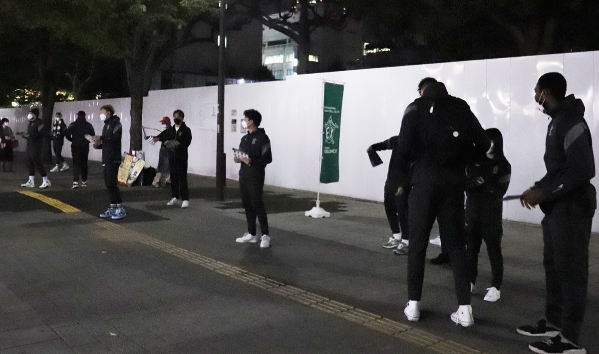 同チームは横浜武道館=中区翁町=をホームアリーナとしており、最寄り駅である関内駅に選手やチームスタッフらが集合。午後5時30分から40分間ほど実施し、駅前の歩行者にチラシを手渡しながら来場を呼びかけた。実際の選手を間近にその身長に驚く人や、選手紹介を見ながら「推しの選手」を探す人の姿も見られた。