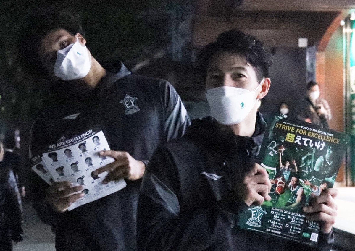 中区を拠点に活動する男子プロバスケットボールBリーグ3部の横浜エクセレンスの選手たちが10月28日、JR関内駅南口前で試合日程や選手紹介が書かれたチラシを配った。