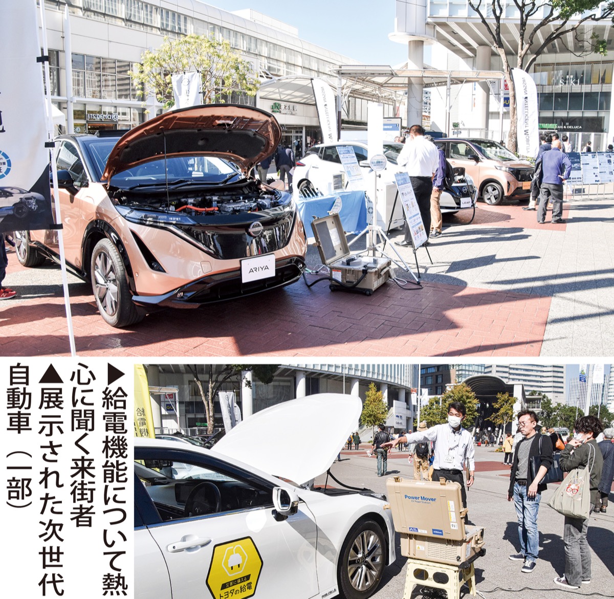 電気自動車(EV)やプラグインハイブリッド自動車(PHV)、燃料電池自動車(FCV)など、温室効果ガス排出削減につながる次世代自動車12車種が11月3日、桜木町駅前広場にずらりと並んだ。祝日の晴天ということもあり、午前中から多くの来街者でにぎわっていた。