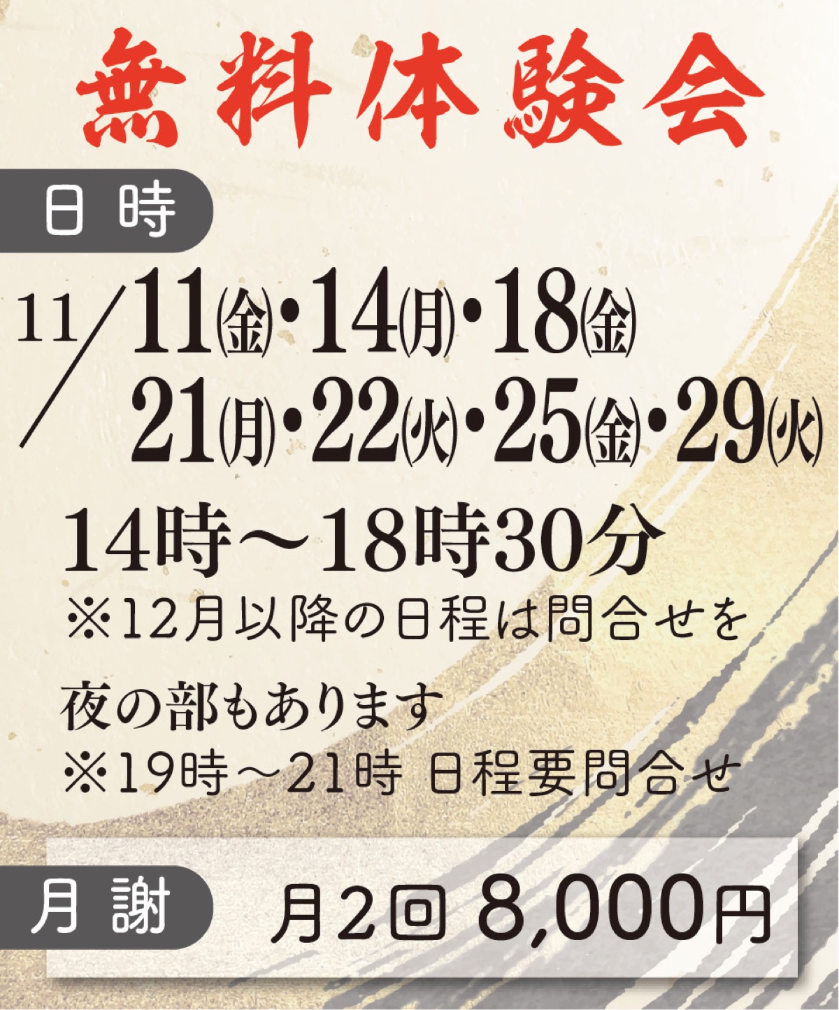 教室は月・火・金の午後開催。まずは無料体験でお試しを。