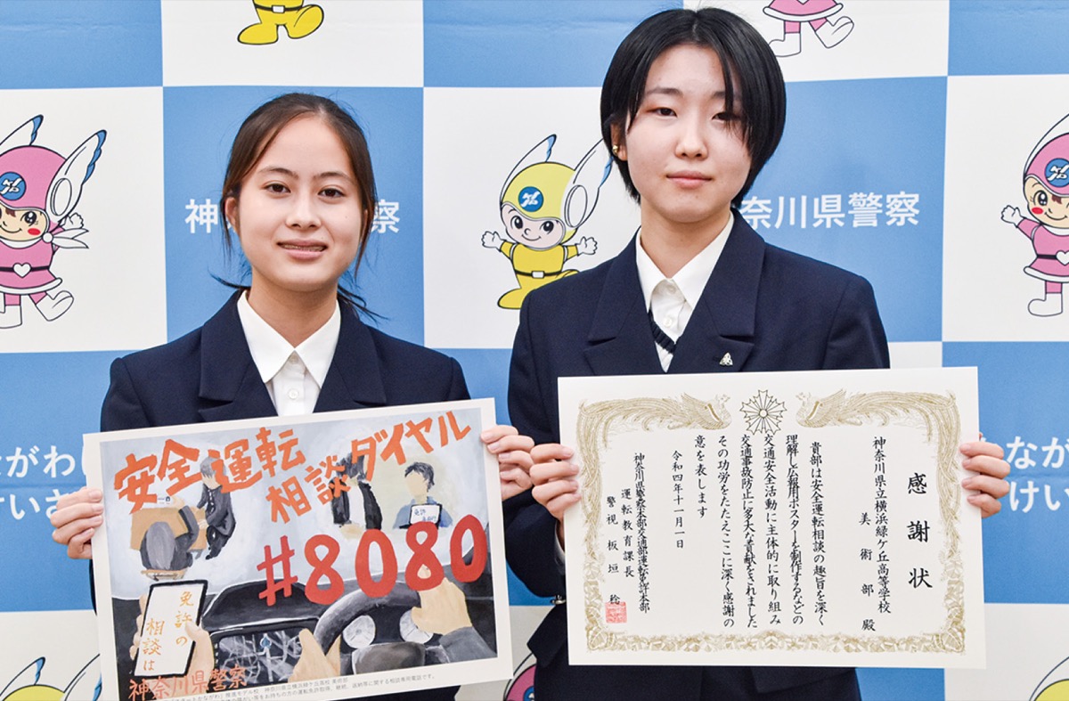 横浜緑ケ丘高校の美術部員が、安全運転相談ダイヤル「#8080」(シャープハレバレ)の周知ポスターを制作したとして、同校で11月1日に神奈川県警察から感謝状が手渡された。