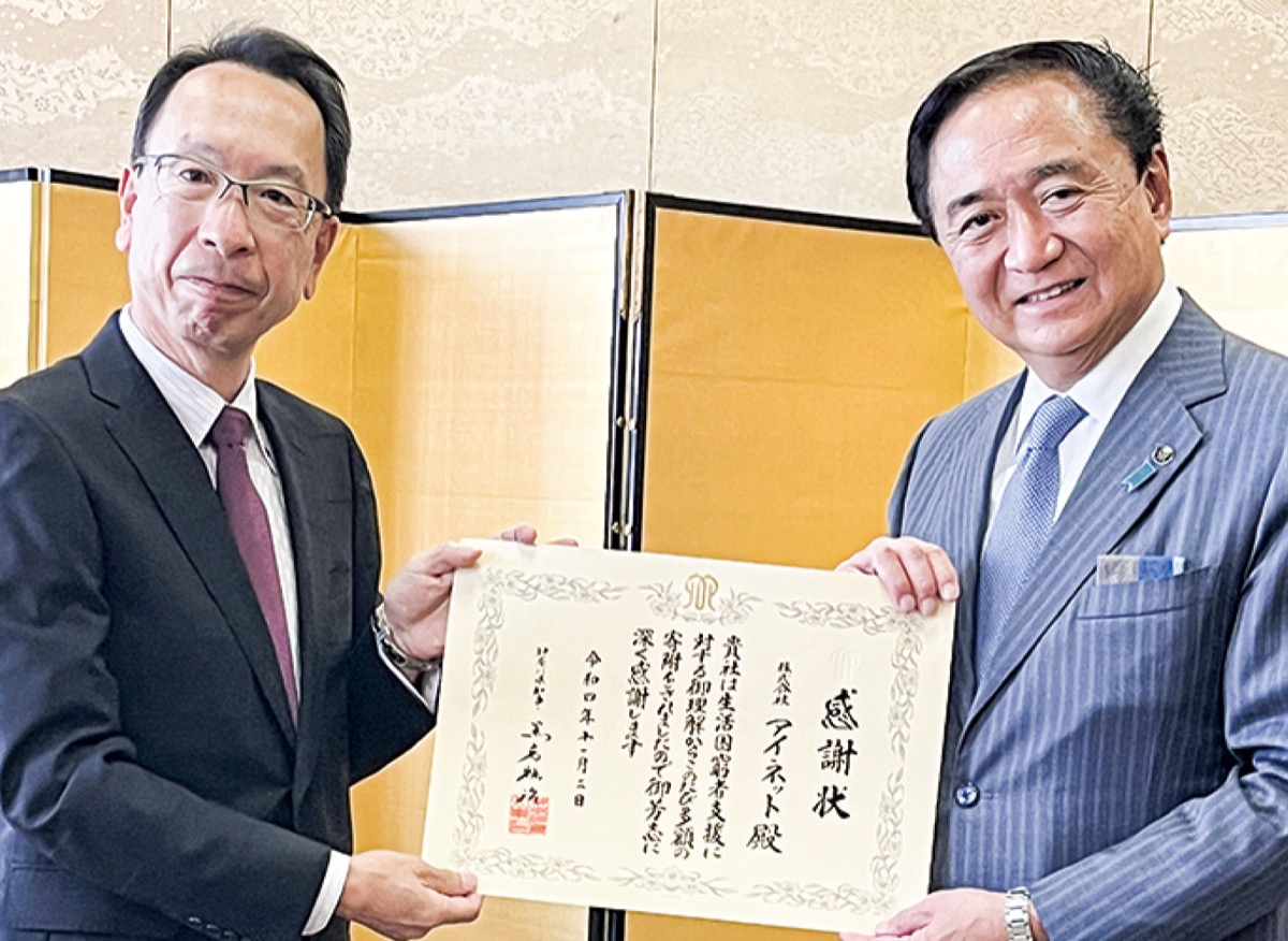 神奈川県は11月2日、生活困窮者支援のために500万円を寄付した(株)アイネット=西区みなとみらい=に対し、感謝状を送った。