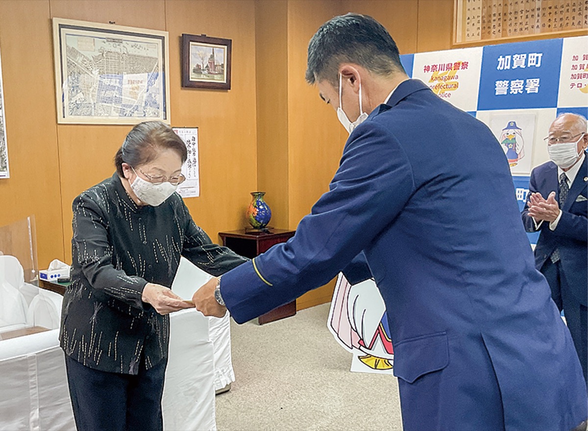 小関さんはこれまで30年近く、パトロールなどを通じて同署管内の防犯活動に尽力。10月末に加賀町署で行われた伝達式で小関さんは「周りの協力があり、活動が楽しかったから続けられた」とにっこり。「年末年始は人出も犯罪も増える時期なので注意していきたい」と気を引き締めた。