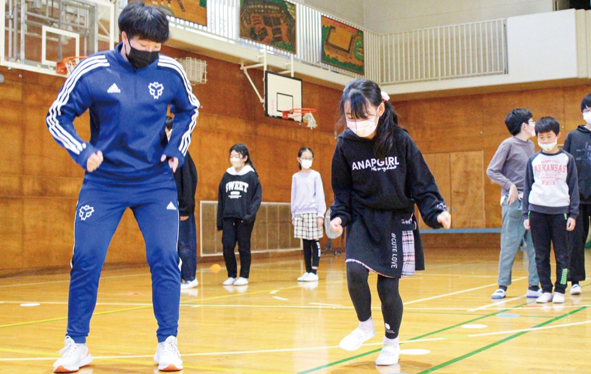 選手のトレーニングに同エクササイズを取り入れている同チーム。当日、児童たちは選手の指導を受け実践した。3種類のボールを使ってキャッチボールをしながら別の動きをするなど、複雑なトレーニングにも取り組んだ。