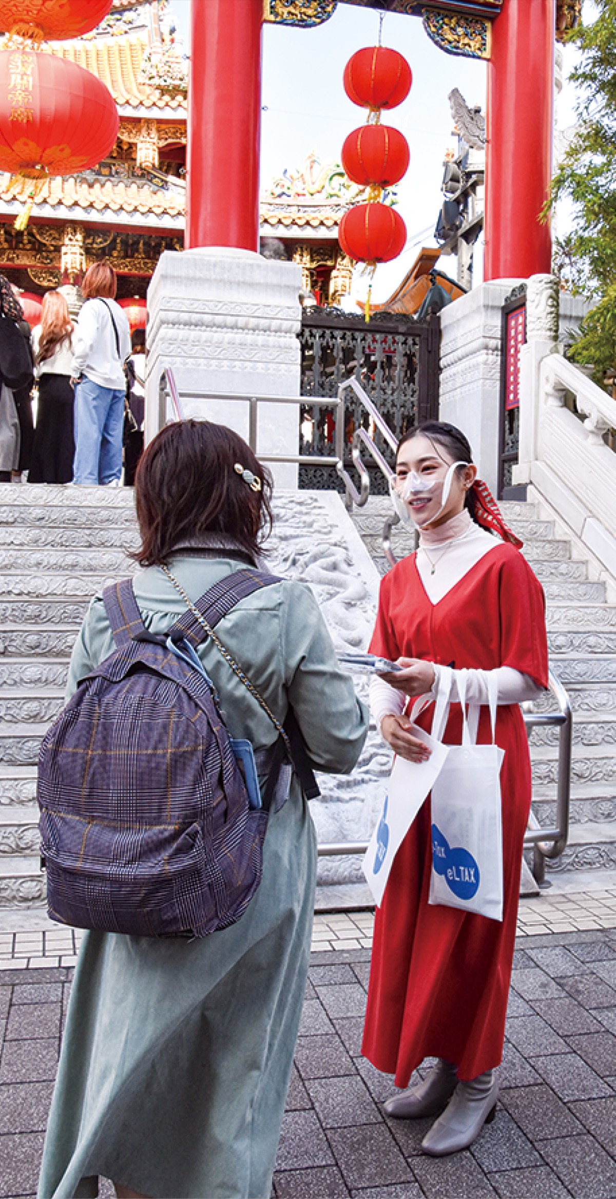 横浜中華街の関帝廟前で11月11日、インボイス制度や国税電子申告・納税システム「e-Tax」など税に関する啓発資料の配布が行われた。11日から17日までの「税を考える週間」に際して、(公社)横浜中法人会(高橋伸昌会長)が中心となって実施した。