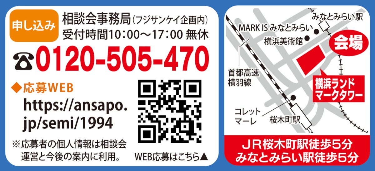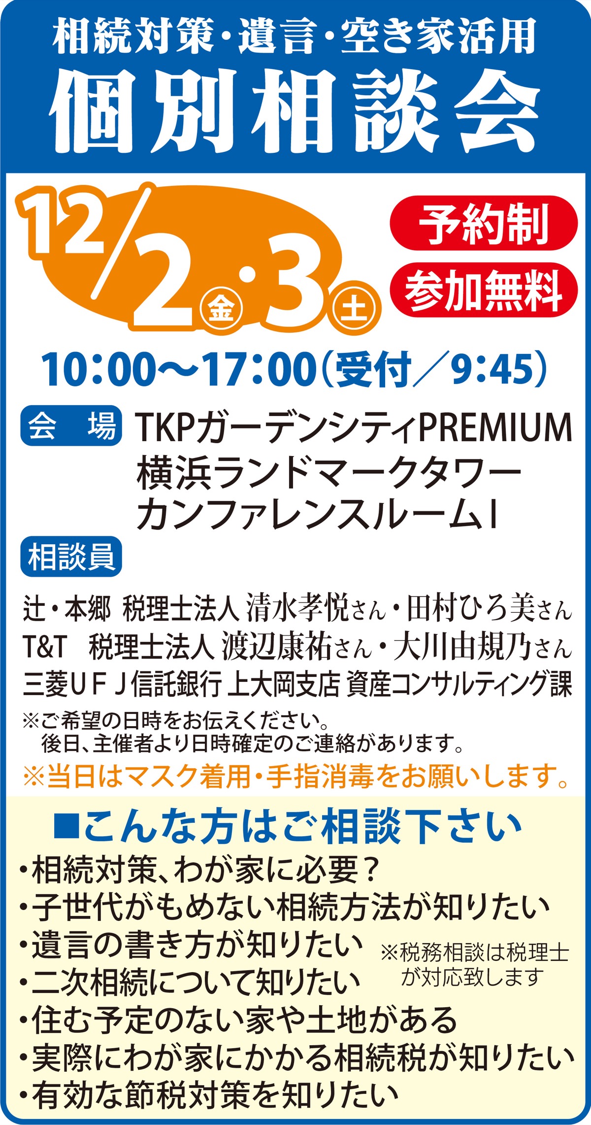 「わが家に相続税はかかる?」「節税対策は必要?」等の疑問や遺言書の書き方、保管方法、不動産の分割や節税対策、空き家の賢い活用方法など気軽に相談できるチャンス。予約制のため希望者は左記へ。
