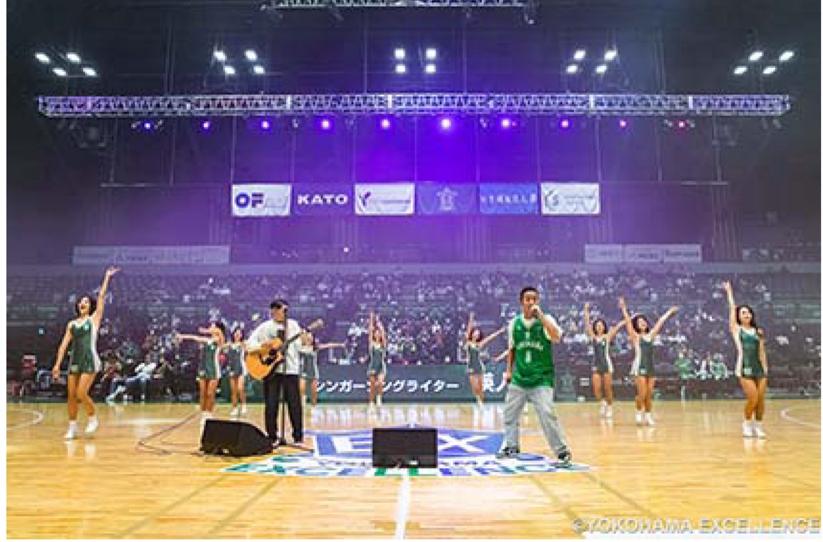 11日のハーフタイムのイベントには、横浜市出身のシンガーソングライター、瑛人さんが登場。大ヒットした『香水』と映画の主題歌にもなった『ピース オブ ケーク』を熱唱。同チームのチアリーダーズ「エレガンス」とコラボレーションしたライブパフォーマンスで会場を盛り上げた。