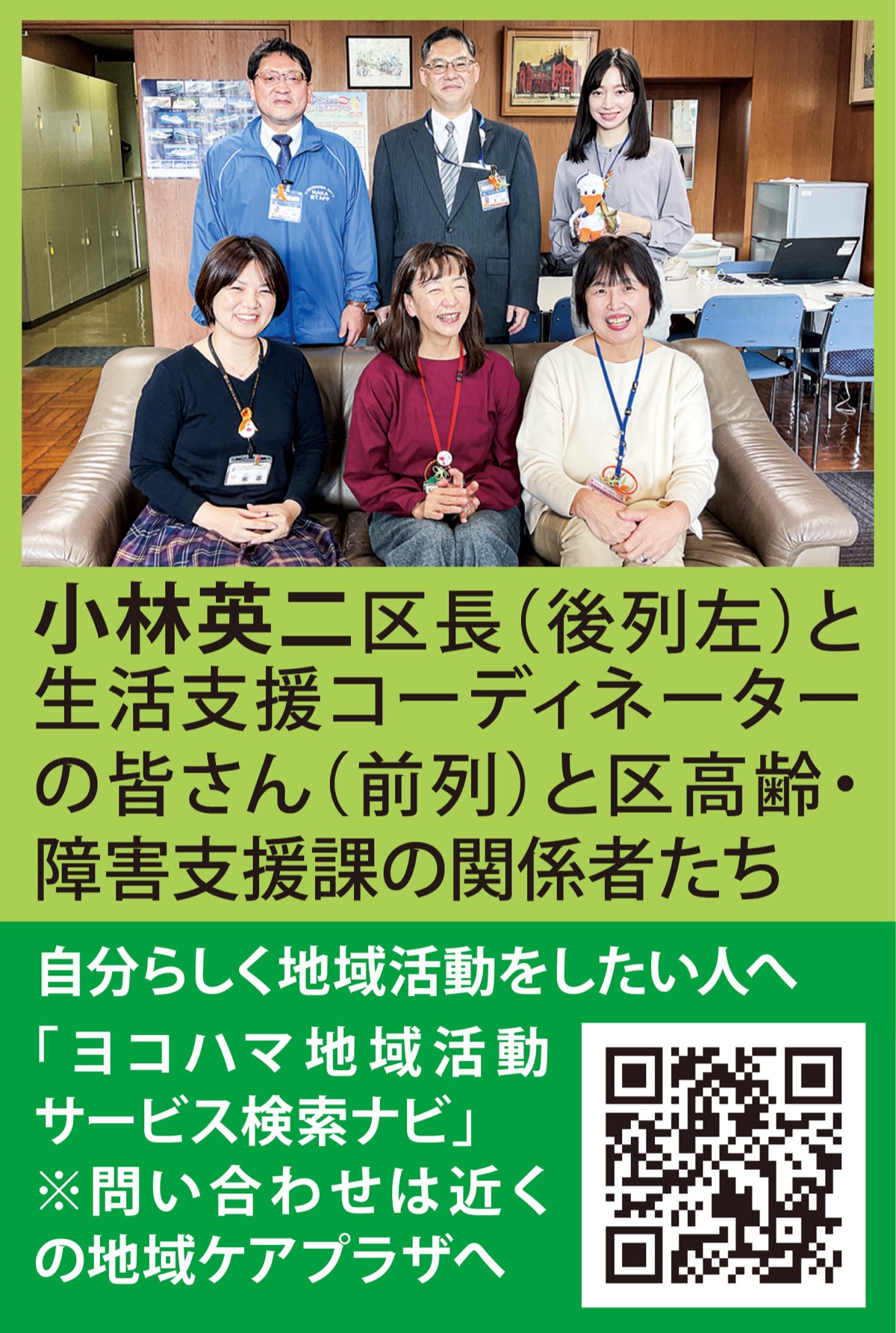 区社協と各地域ケアプラザに1人ずつ、生活支援コーディネーターさんがいることを知っていますか?皆さんが住み慣れたまちで「居場所」や「役割」を持って生活ができるよう手伝いをしてくれる方々です。コーディネーターさんは、積極的に地域に出て声がけをし、地域の人たちの声を拾い、困った時に手を差し伸べてくれます。
