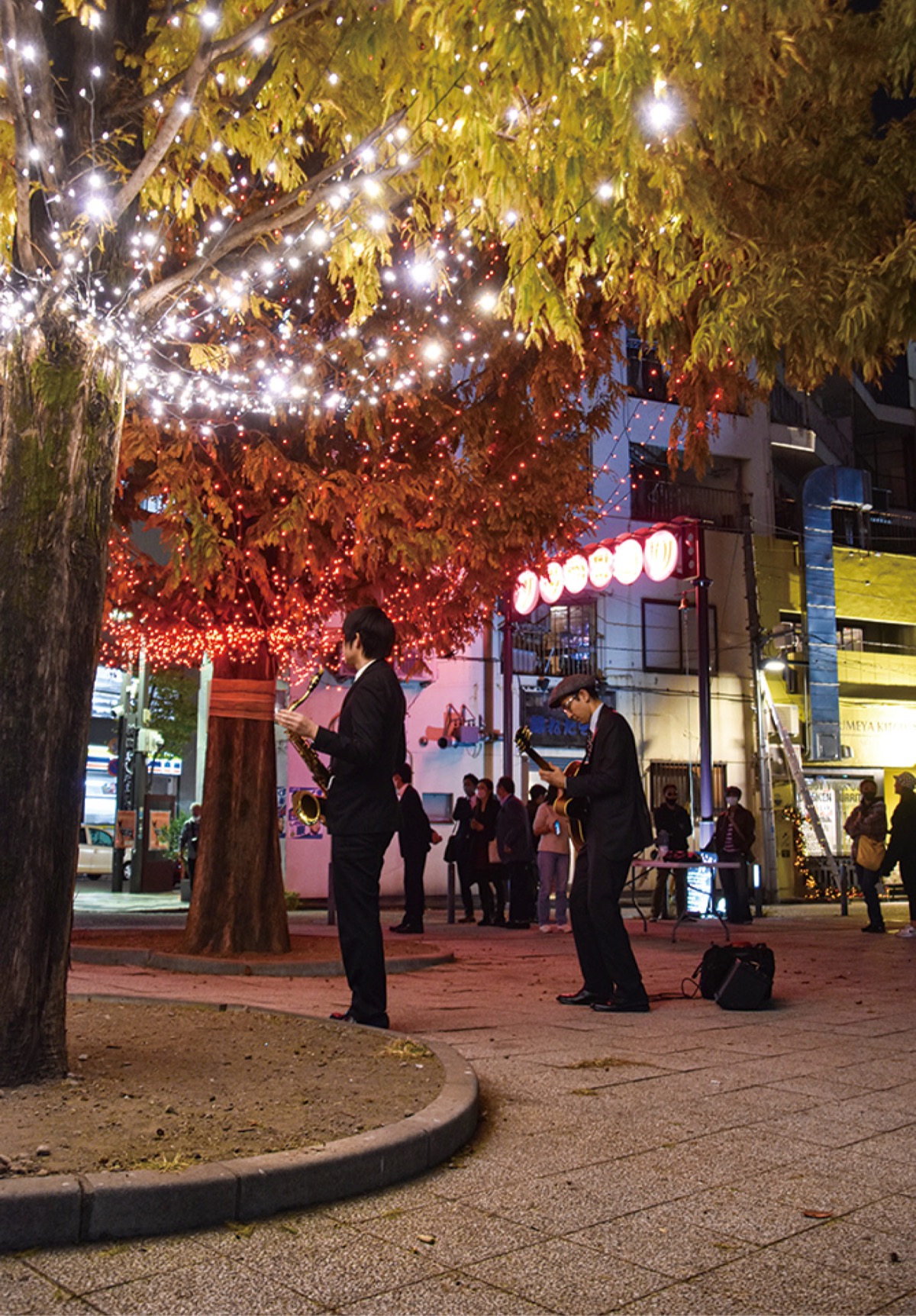 点灯式は日が暮れた午後5時からスタート。商店街の吉田和正理事長をはじめ吉田町町内会の今井大会長、隣接する福富町町内会の小島正男副会長らが出席。鐘を鳴らして点灯を祝うとともに、ギターとサックスの生演奏がクリスマスの雰囲気に花を添えていた。