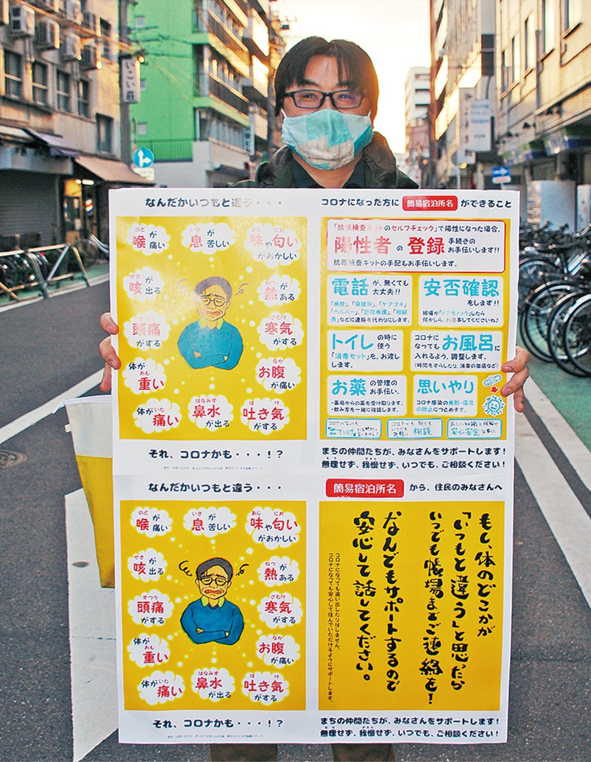 トイレや風呂、エレベーターなど共有スペースがあり、基礎疾患がある人も多く利用する簡宿の感染対策は必須。そのため、利用者自身が感染したことに気づいた場合、帳場に報告や相談をしてもらう必要がある。そこで、大和荘を運営する(有)ヤマトの取締役、高山清美さんがポスター制作を発案。目に付きやすいところにコロナの症状や支援に関する内容を掲示することで「コロナがタブーな話題ではなくなり、コロナについて話したり相談したりするきっかけになるはず」と高山さんは話す。
