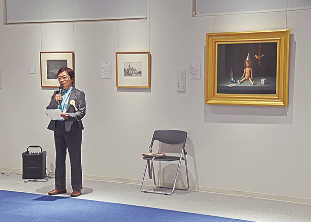 「岩田榮吉と恩師・畏友 小磯良平・伊藤廉・長谷川潔をはじめとして」と題して、岩田の自画像や風景画、恩師や友人による作品など約30点を展示。企画展の開会にあたりあいさつした(公財)横浜本牧絵画館の武田春子理事長は、岩田についていち早く画家のフェルメールに注目し、その影響を受けたことから「岩田はフェルメールに心をひかれていた。その足跡を辿っていただければ」と話した。