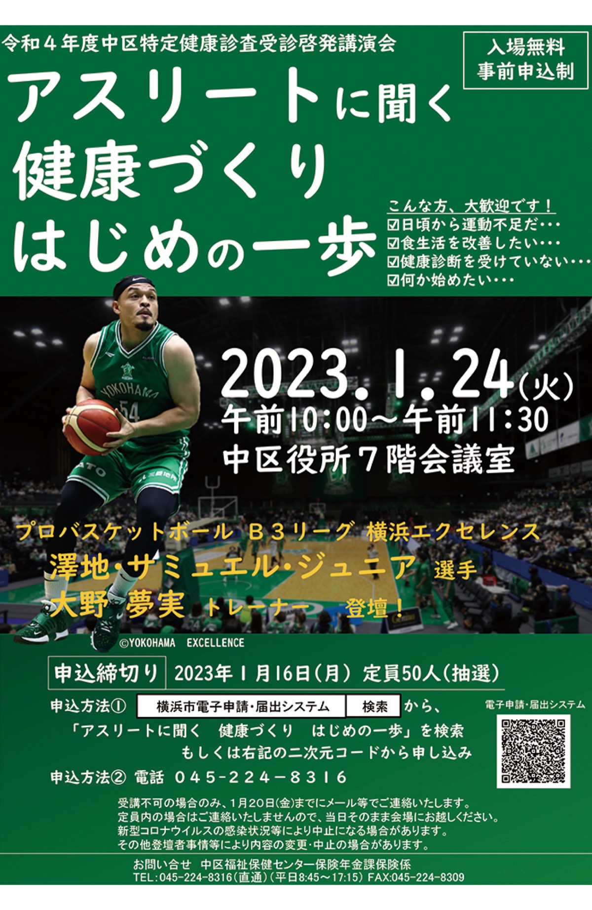 中区を拠点に活動する男子プロバスケットボールB3・横浜エクセレンスの選手とそのトレーナーによる健康づくり講座が1月24日(火)、中区役所7階会議室で開かれる。午前10時(開場9時30分)から11時30分まで。入場無料。