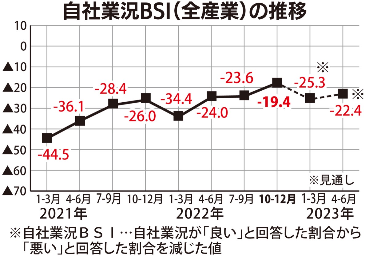 自社の景況を判断する指標「自社業況BSI」は全産業でマイナス19・4となり、前期よりも4・2ポイント上昇した。22年4-6月期から3期連続上昇しているものの、依然としてマイナスが続いている。