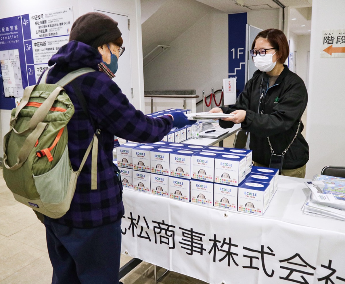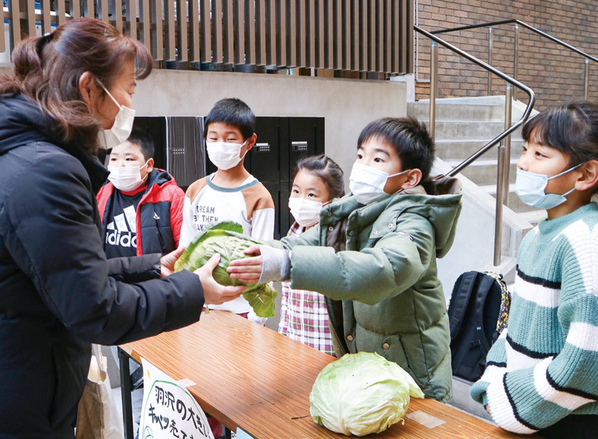 1月11日に開かれたマルシェでは、羽沢小学校=神奈川区=の児童が、自作のキャベツを販売。また、資源循環のしくみを理解してもらおうと、廃棄物処理などを手掛ける武松商事(株)=中区山下町=の協力で新聞紙や雑誌、菓子の空箱などをティッシュボックスに交換するイベントも開かれ、会場はにぎわった。