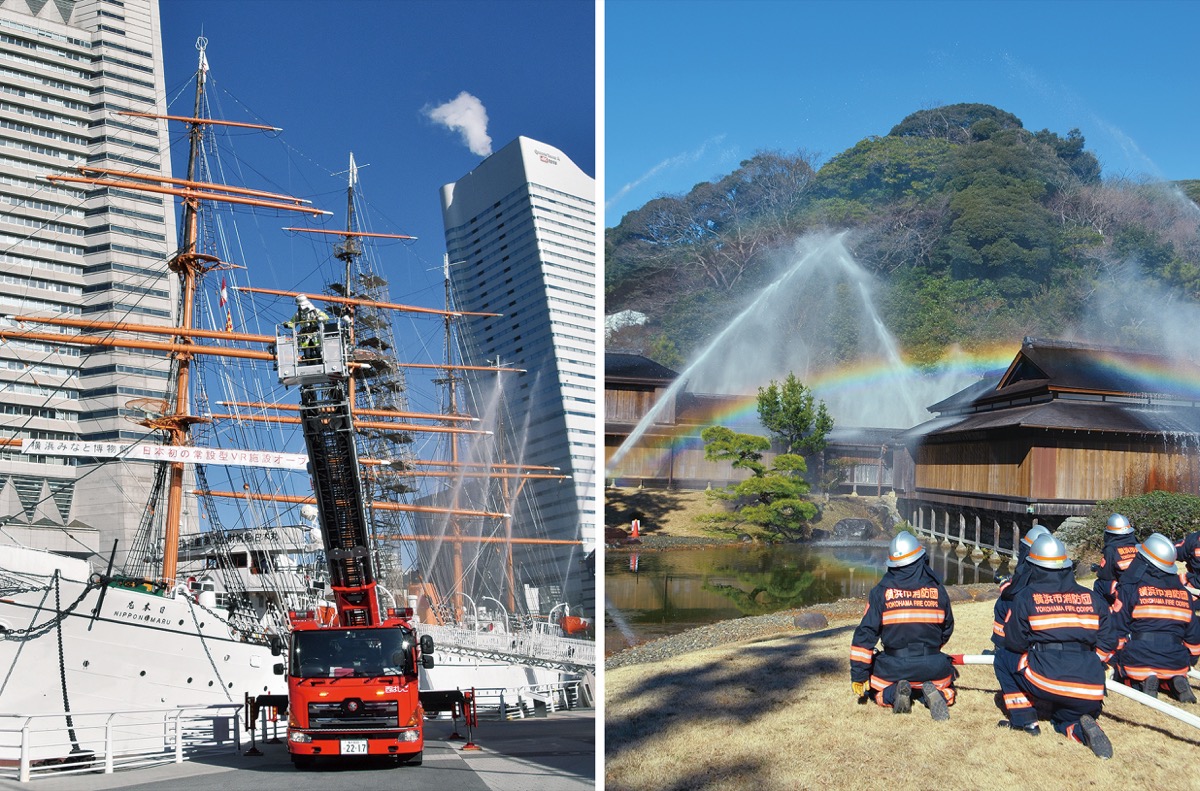 1月26日の「文化財防火デー」に合わせて、帆船日本丸と三溪園の臨春閣で消防訓練が行われた。消防隊や施設関係者が参加し、対応や流れを確認。文化財の継承と、さらなる防火意識の向上に努めた。