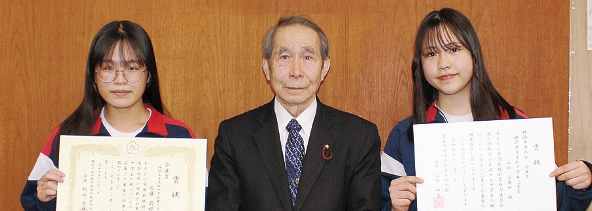 1月30日には横浜中央納税貯蓄組合総連合会の松山秀雄会長が老松中学校を訪れ、同総連合会会長賞に輝いた『私達と税金』を書いた内藤莉那さんと、横浜中法人会会長賞の『税金を納めるとは』を手掛けた山田真美加さんに表彰状を手渡した。いずれも3年生。
