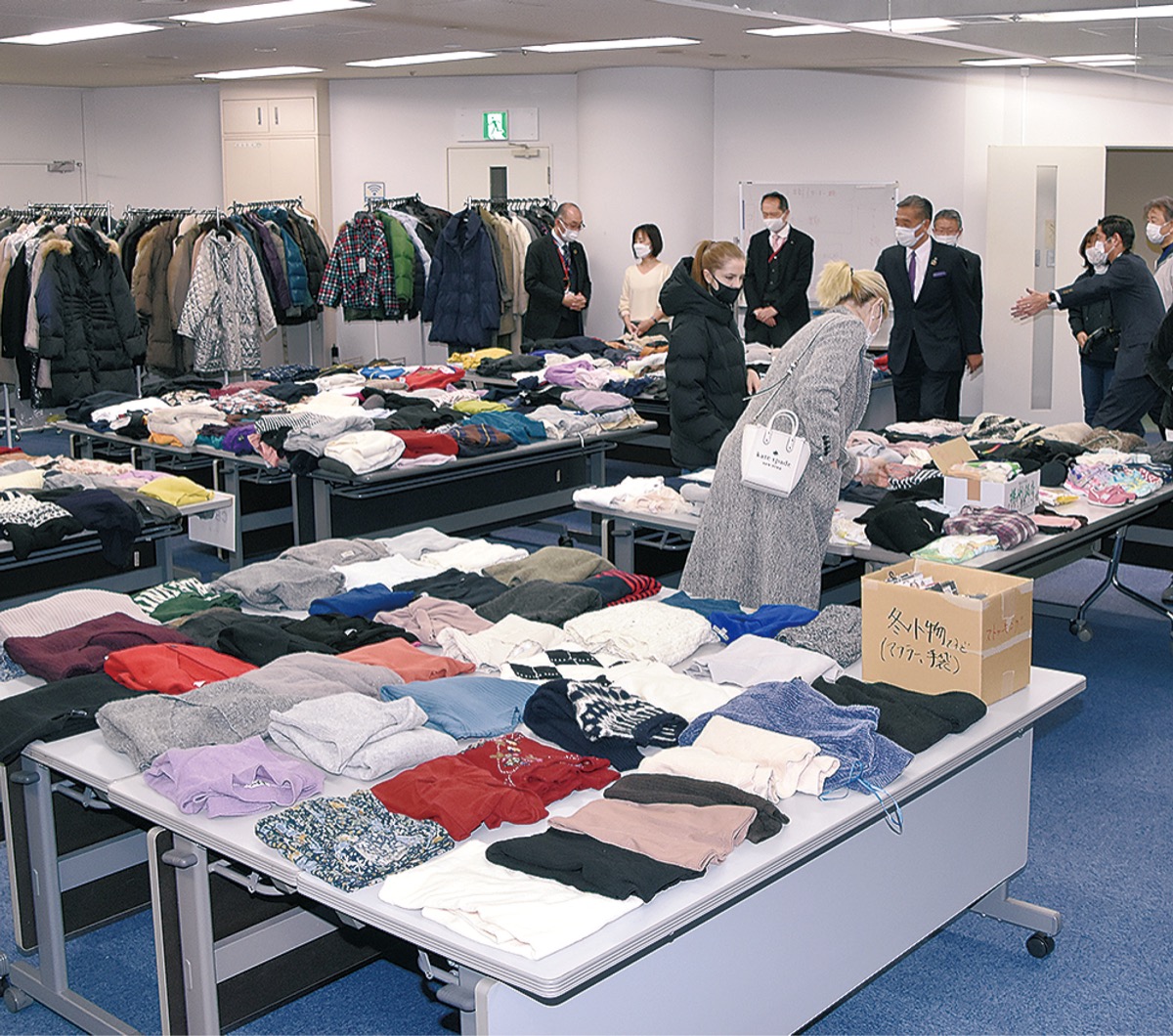横浜国際協力センター=西区みなとみらい=の一室に、コートをはじめセーターやフリース、またTシャツなど様々な衣料品が並んだ。初日の3日には午前10時の開所とともにウクライナの人たちが訪れ、熱心に衣類を選ぶ姿が見られた。