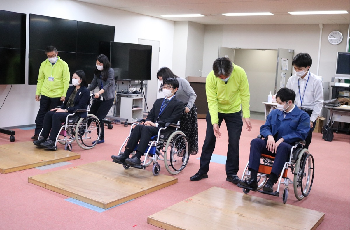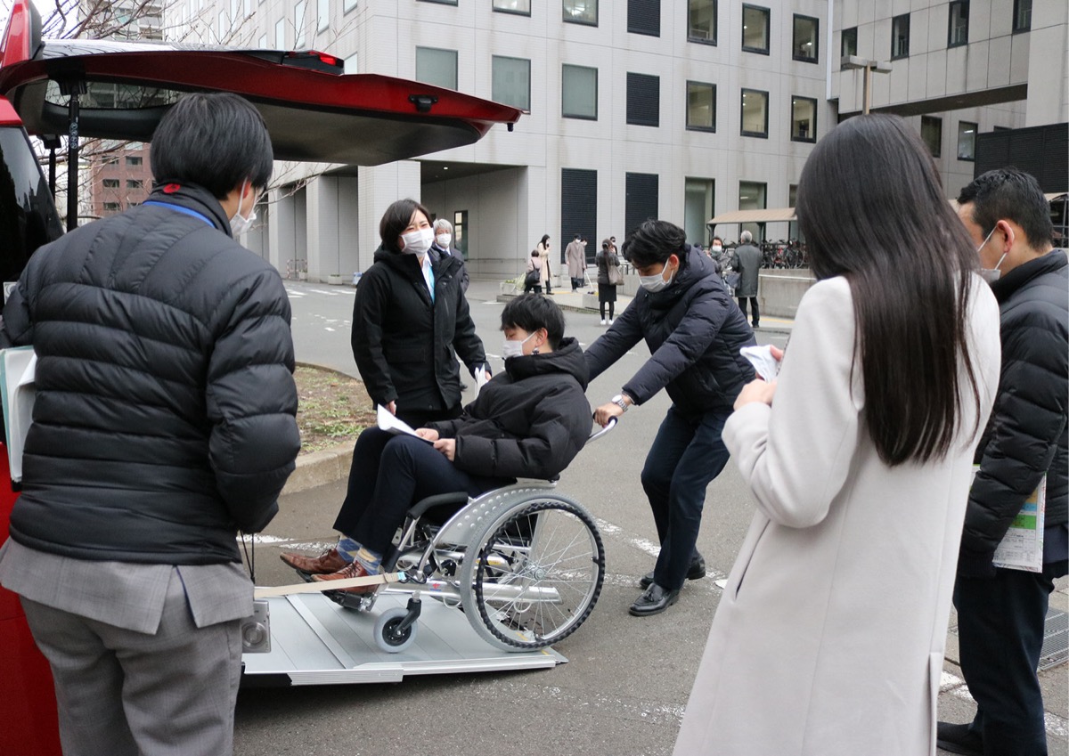 高齢化社会に伴い介護や福祉車両のニーズが拡大するなか、体験を通じて理解を深めてもらおうと、ウエインズトヨタ神奈川株式会社(宮原漢二社長)=中区山下町=が2月3日、国土交通省関東運輸局=中区北仲通=の職員を対象にした「バリアフリー教室」を行った。