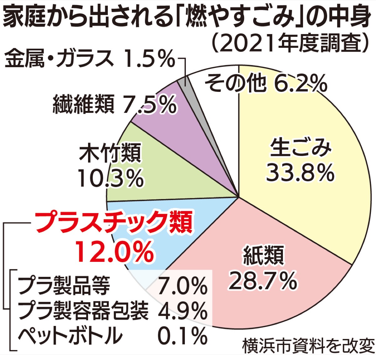 一方、バケツや歯ブラシ、ハンガーなどプラでできた製品は、生ごみと同じ「燃やすごみ」の扱いだ。市の21年度調査では、燃やすごみの中に分別対象ではないプラ製品等が7%含まれていた。一般的な算定だと1kgのプラごみを燃やすと、2・77kgの二酸化炭素が発生するとされ、焼却されるプラ製品等の分別とリサイクルが脱炭素社会に向けた大きな課題だ。