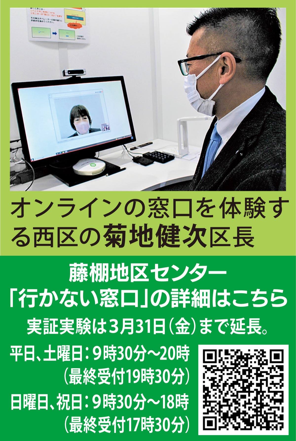 「デジタル区役所」のモデル区に選定されている西区では、その取組の一環として3月末まで藤棚地区センターで「行かない窓口」の実証実験を行っています。