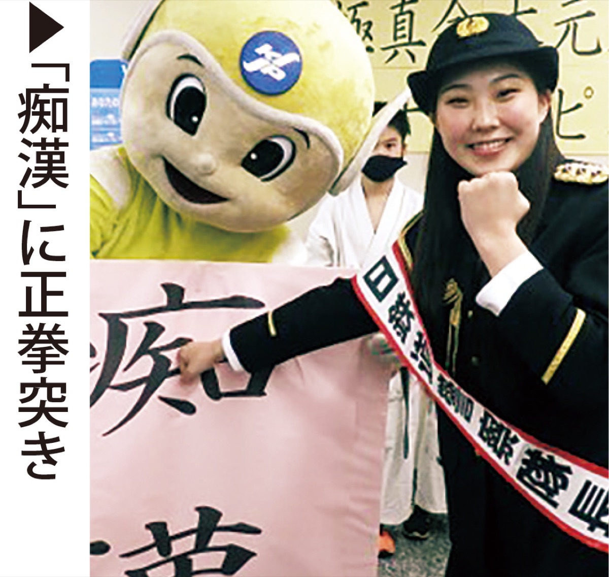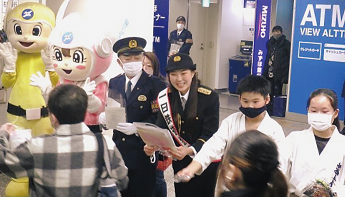 受験シーズンにおける電車内、鉄道施設での痴漢や盗撮、また自転車の盗難、高齢者を狙った特殊詐欺などの未然防止啓発が目的。制服姿の冨村さんは、所属する新極真会神奈川東横浜支部(木元正資師範)の門下生をはじめ、JR東日本の社員らと共に駅構内で防犯チラシを配った。