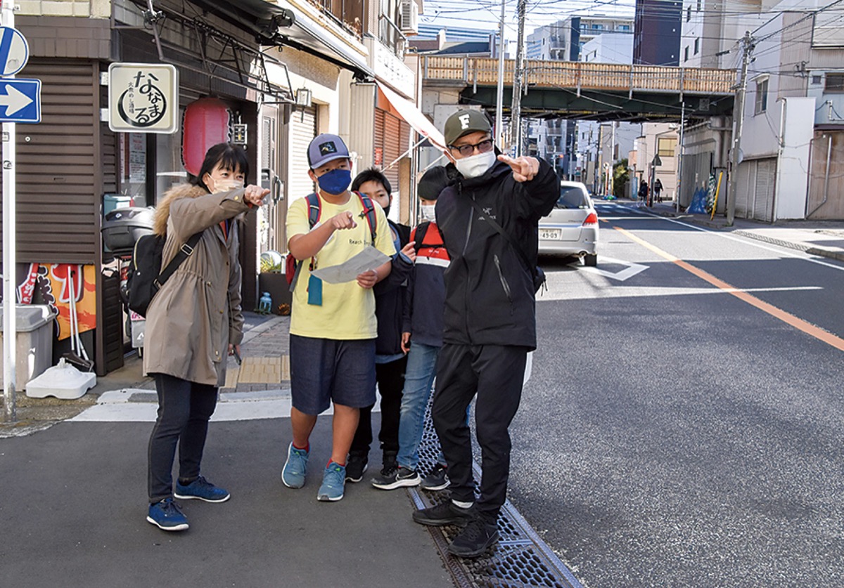 当日は地域住民や保護者らと、同クラスの児童がそれぞれ2、3人ずつ集まって1つの班を構成、計9班で取り組んだ。まずは参加者が学区の地図に「アート」になるように歩くコースを書き込む。その地図を参考にアプリを入れた大人のスマホを使って班ごとに地域を歩いた。